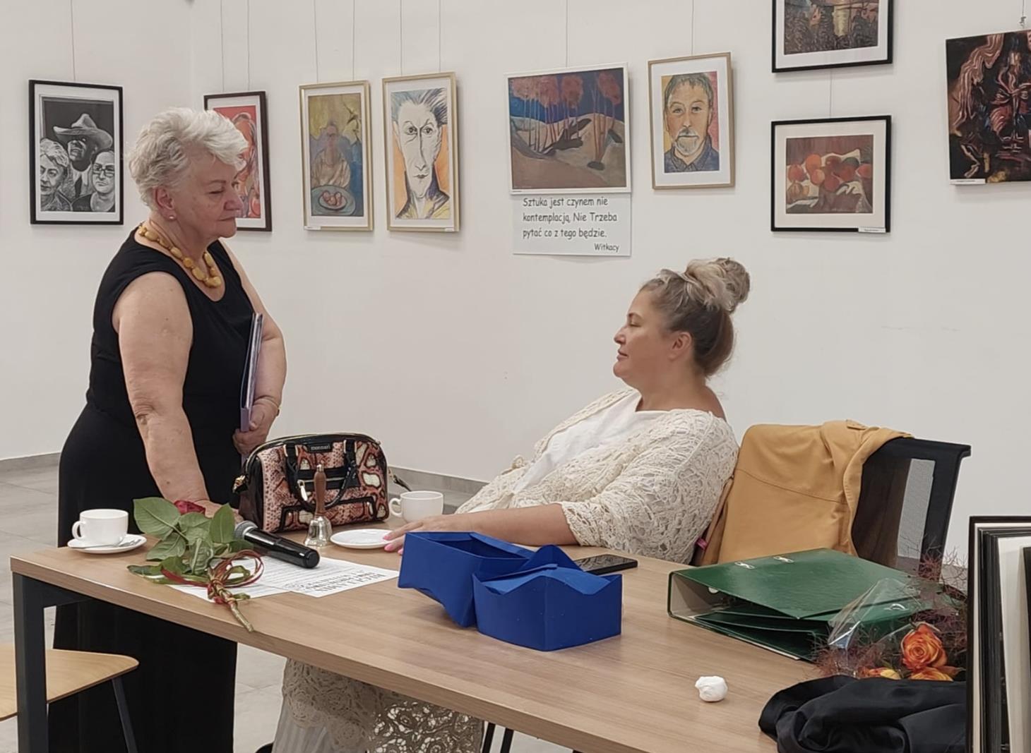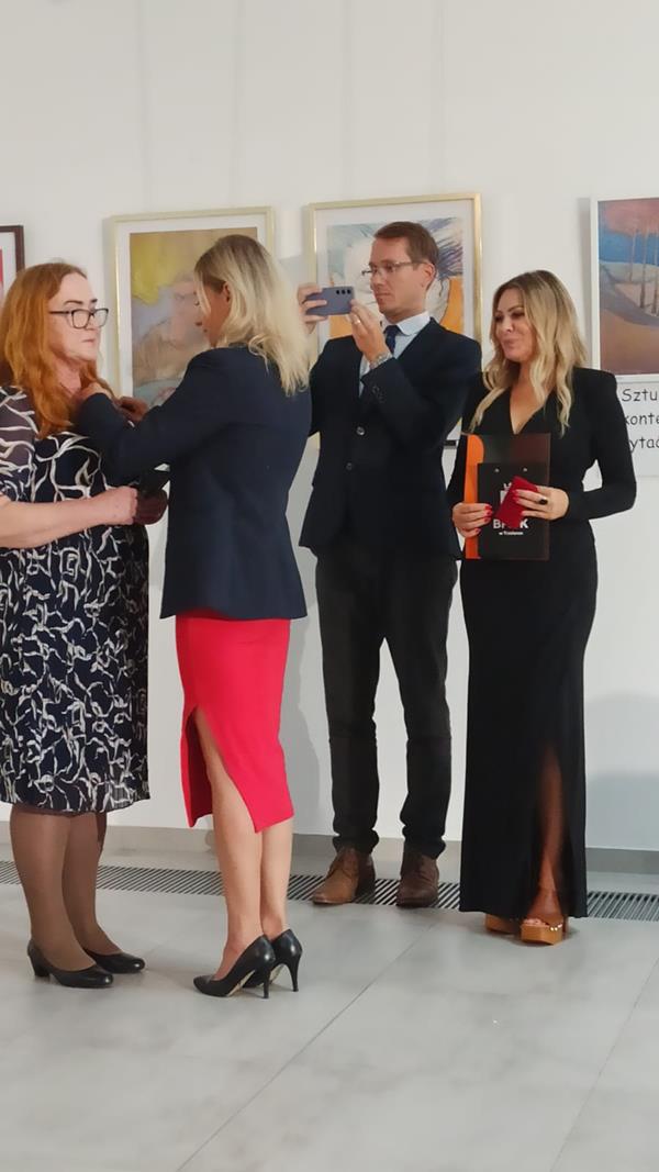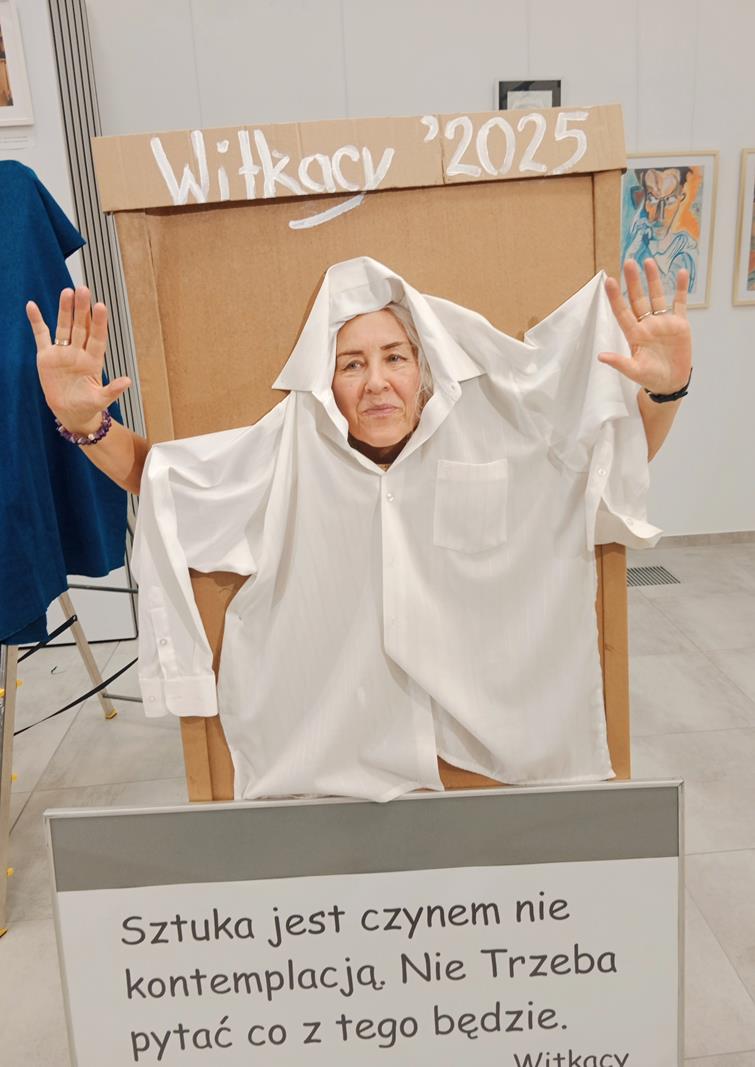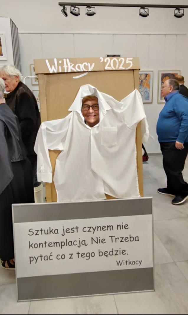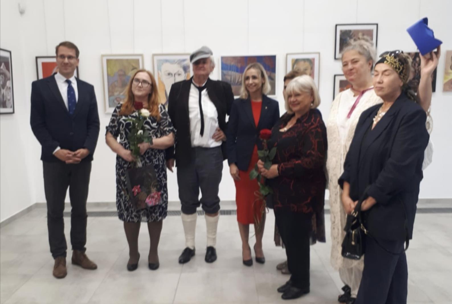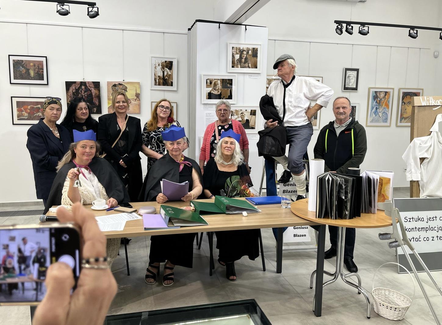 Nie zabrakło gości, którzy skorzystali z naszego zaproszenia i licznie przyszli na przygotowane przez nas wydarzenie kulturalne. Wśród nich swoją obecnością zaszczycili nas m.in.: pani Marta Magda z Urzędu Marszałkowskiego Województwa Wielkopolskiego, pan Krzysztof Jaworski Burmistrz Trzcianki, pani Joanna Harbuzińska Turek – prezes Delegatury Wielkopolskiej Izby Lekarskiej i pani Dominika Jeske Dyrektor Biblioteki Publicznej i Centrum Kultury w Trzciance oraz grono przyjaciół. Otwarcie wystawy można uważać za udane, wszyscy byli poruszeni przedstawieniem spektaklu oraz pod wrażeniem przygotowanych prac wzorujących się na twórczości Witkacego. A na wystawę swoje prace przygotowali: Aleksandra Abramczyk, Regina Ankiewicz, Bogumiła Bumbul, Wanda Dylla, Ewa Jabłońska, Grzegorz Koźmiński, Barbara Laskowska, Sławomira Lewińska, Bogusława Różańska i Lidia Wszołek. Oprócz kontemplacji wystawy przy kawie czy herbatce, można było raczyć się ciastem przygotowanym przez nasze panie z JELO a także zrobić sobie zdjęcie przeistaczając się w mistrza Witkacego. Miłym akcentem tego wieczoru było odznaczenie naszej prezeski Bogusławy Różańskiej Odznaką Honorową Za zasługi Dla Województwa Wielkopolskiego. Serdecznie gratulujemy!