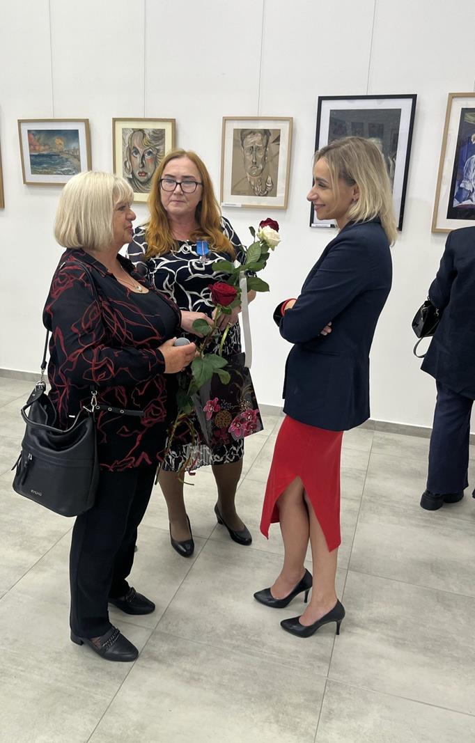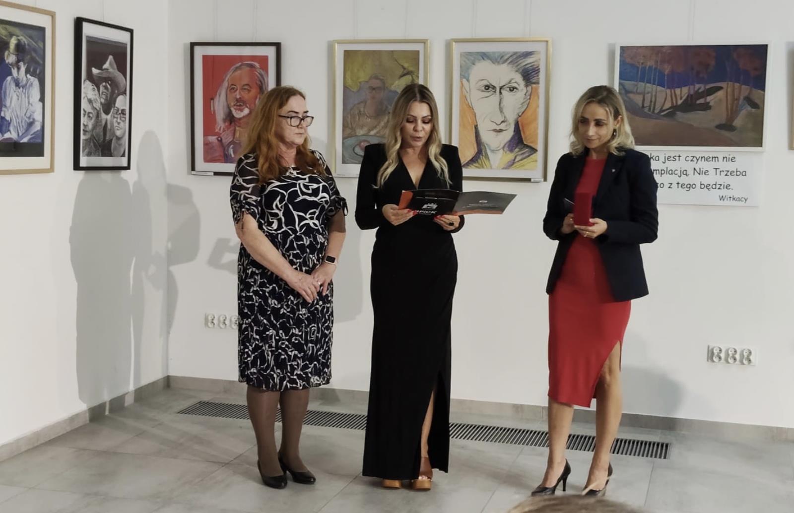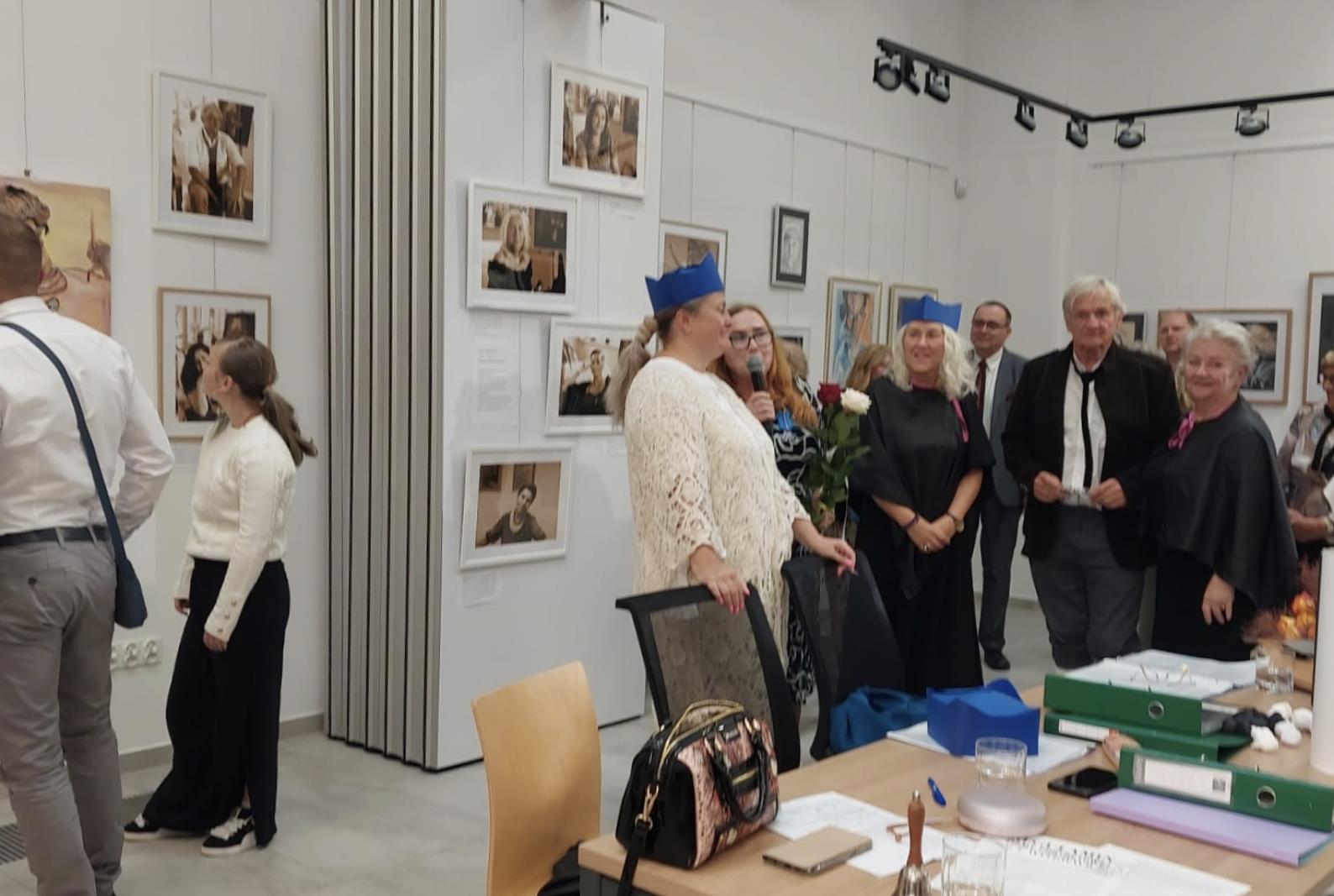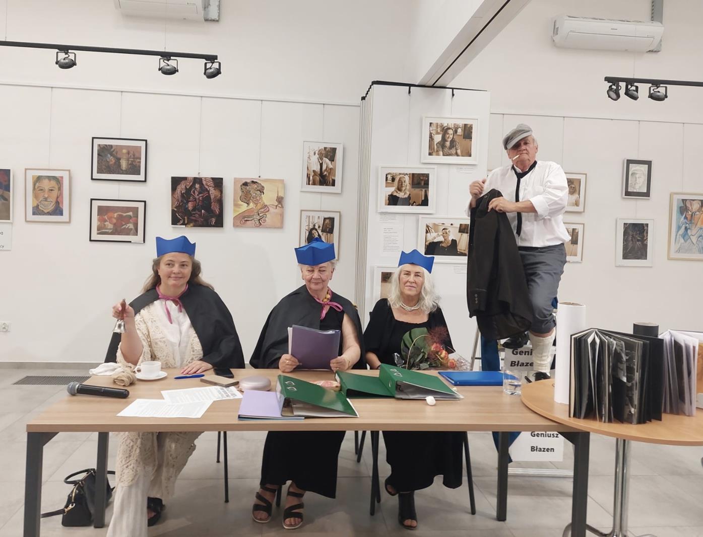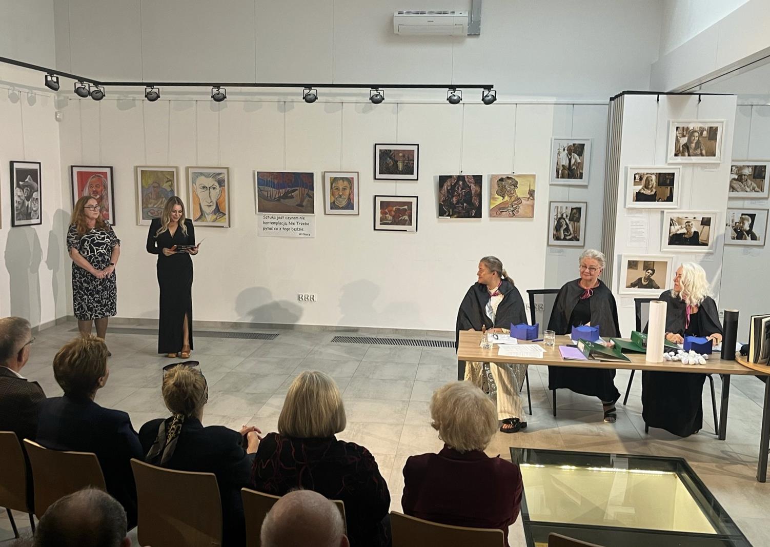 Nie zabrakło gości, którzy skorzystali z naszego zaproszenia i licznie przyszli na przygotowane przez nas wydarzenie kulturalne. Wśród nich swoją obecnością zaszczycili nas m.in.: pani Marta Magda z Urzędu Marszałkowskiego Województwa Wielkopolskiego, pan Krzysztof Jaworski Burmistrz Trzcianki, pani Joanna Harbuzińska Turek – prezes Delegatury Wielkopolskiej Izby Lekarskiej i pani Dominika Jeske Dyrektor Biblioteki Publicznej i Centrum Kultury w Trzciance oraz grono przyjaciół. Otwarcie wystawy można uważać za udane, wszyscy byli poruszeni przedstawieniem spektaklu oraz pod wrażeniem przygotowanych prac wzorujących się na twórczości Witkacego. A na wystawę swoje prace przygotowali: Aleksandra Abramczyk, Regina Ankiewicz, Bogumiła Bumbul, Wanda Dylla, Ewa Jabłońska, Grzegorz Koźmiński, Barbara Laskowska, Sławomira Lewińska, Bogusława Różańska i Lidia Wszołek. Oprócz kontemplacji wystawy przy kawie czy herbatce, można było raczyć się ciastem przygotowanym przez nasze panie z JELO a także zrobić sobie zdjęcie przeistaczając się w mistrza Witkacego. Miłym akcentem tego wieczoru było odznaczenie naszej prezeski Bogusławy Różańskiej Odznaką Honorową Za zasługi Dla Województwa Wielkopolskiego. Serdecznie gratulujemy!